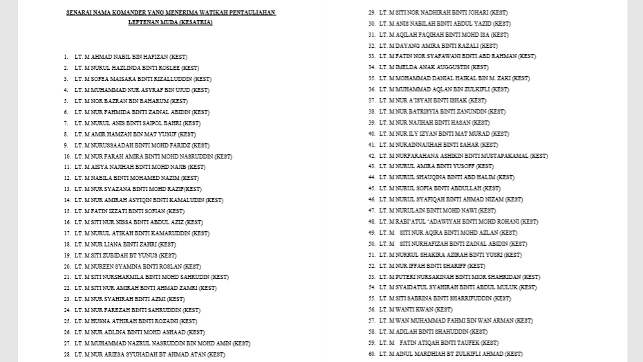 Senarai nama watikah pentauliahan Leftenan Muda Kesatria.